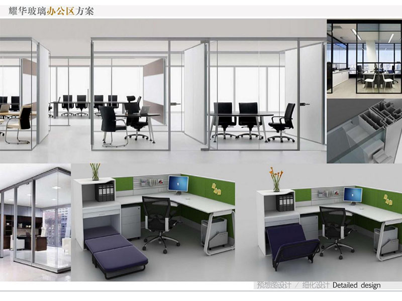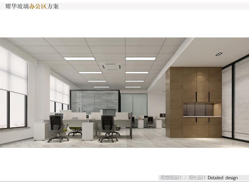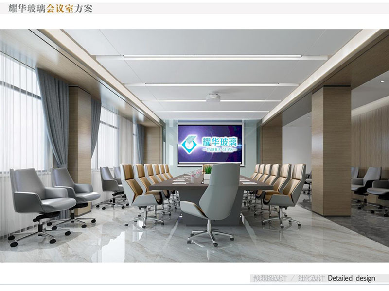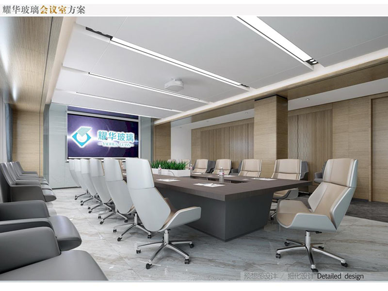 設(shè)計(jì)理念: 耀華玻璃辦公區(qū)裝修效果注重體現(xiàn)了現(xiàn)代與實(shí)用性的結(jié)合。辦公空間寬敞明亮,采用高品質(zhì)材料打造,使用耀華玻璃作為隔斷墻提升了整體美觀度,而且采用落地窗可以增強(qiáng)自然采光效果。會(huì)議室空間足夠大,利用了耀華玻璃進(jìn)行隔斷,從而達(dá)到了隔音效果好。營(yíng)造出高效、舒適的辦公環(huán)境。