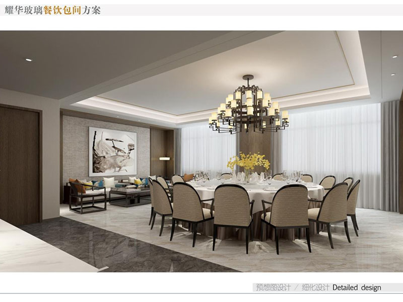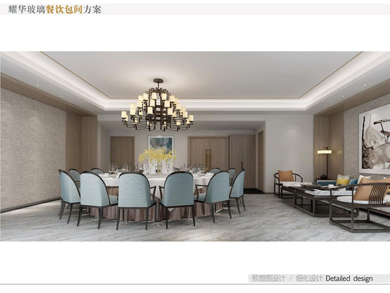 設(shè)計(jì)理念: 耀華玻璃餐飲包間裝修效果將現(xiàn)代與雅致的風(fēng)格混搭。包間內(nèi)采用柔和的燈光與精致的裝飾,營(yíng)造出溫馨舒適的用餐氛圍。墻面選用高質(zhì)量的裝飾玻璃,既美觀又實(shí)用,同時(shí)展現(xiàn)了耀華玻璃的產(chǎn)品特色,為顧客提供愉悅的用餐體驗(yàn)。