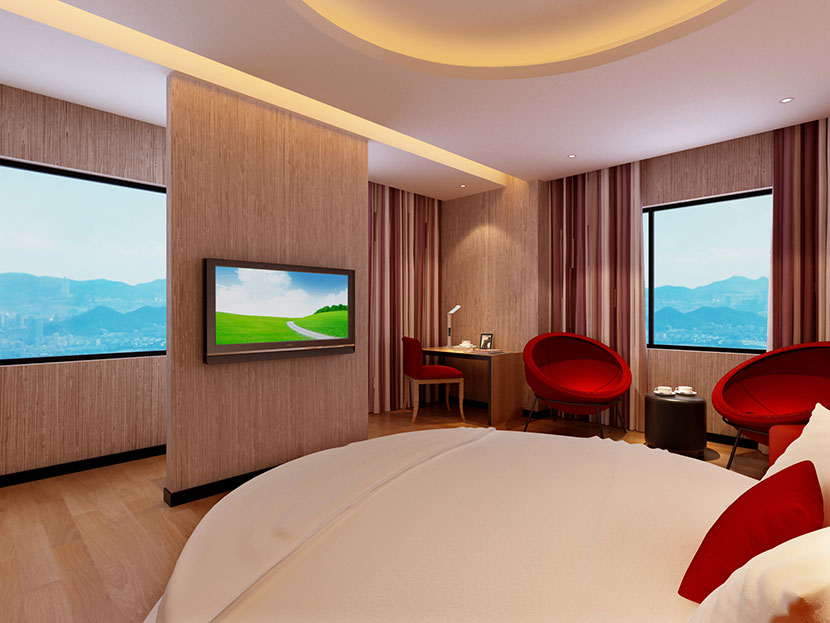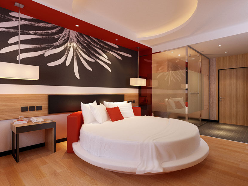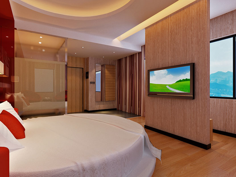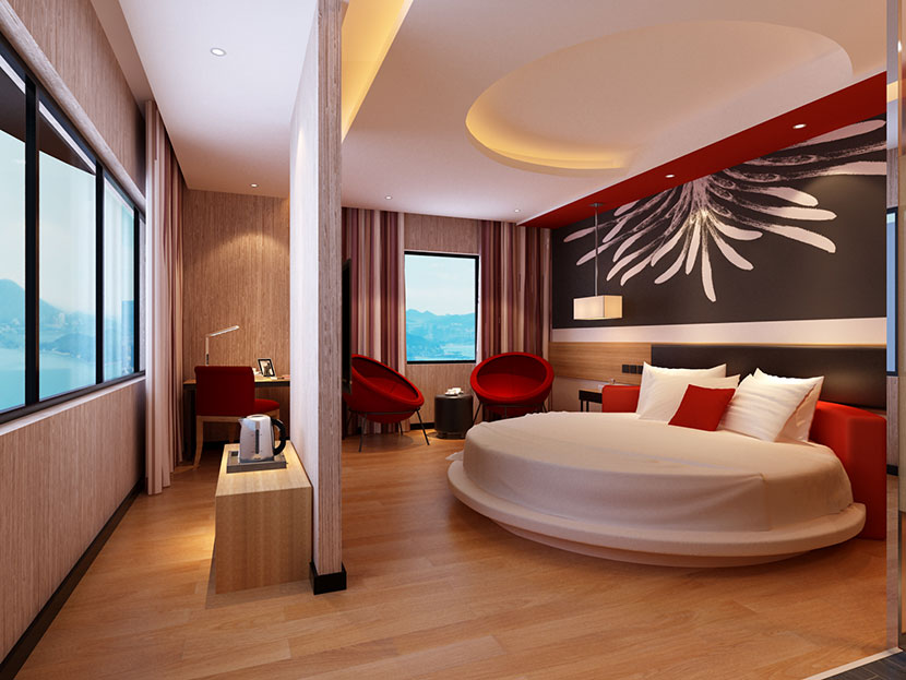 圓床房裝修效果獨(dú)特而浪漫,以圓形為主題設(shè)計(jì)。床頭背景墻采用柔和的色調(diào)與溫馨材質(zhì),利用鮮艷的紅色搭配軟包,圓形的床架搭配舒適的床墊與抱枕,不僅視覺(jué)上新穎別致,更提供了全方位的舒適體驗(yàn)。房間內(nèi)燈光設(shè)計(jì)柔和,通過(guò)壁燈、臺(tái)燈以及可調(diào)光的主燈,營(yíng)造出浪漫溫馨的氛圍,讓情侶們共度美好時(shí)光。整體裝飾簡(jiǎn)潔而不失精致,每一處細(xì)節(jié)都透露著對(duì)浪漫與舒適的追求。